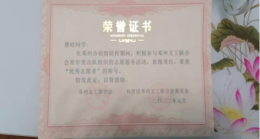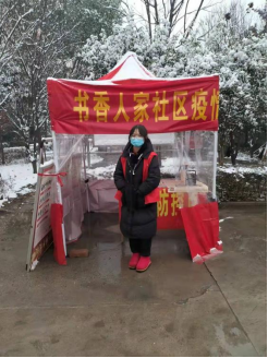 今年寒假,惠晗志愿加入了邓州义工联合会组织的疫情防控志愿服务队,成为一名光荣的返乡志愿者。作为一名返乡大学生,在这个特殊的时期,她深知应该承担起更多的责任。在志愿服务期间,她准时到达志愿卡点,协助工作人员做好防疫抗疫工作。面对严寒和疫情毅然“逆行”,用自己所学服务家乡,向乡亲们展示了中国当代青年的责任与担当!